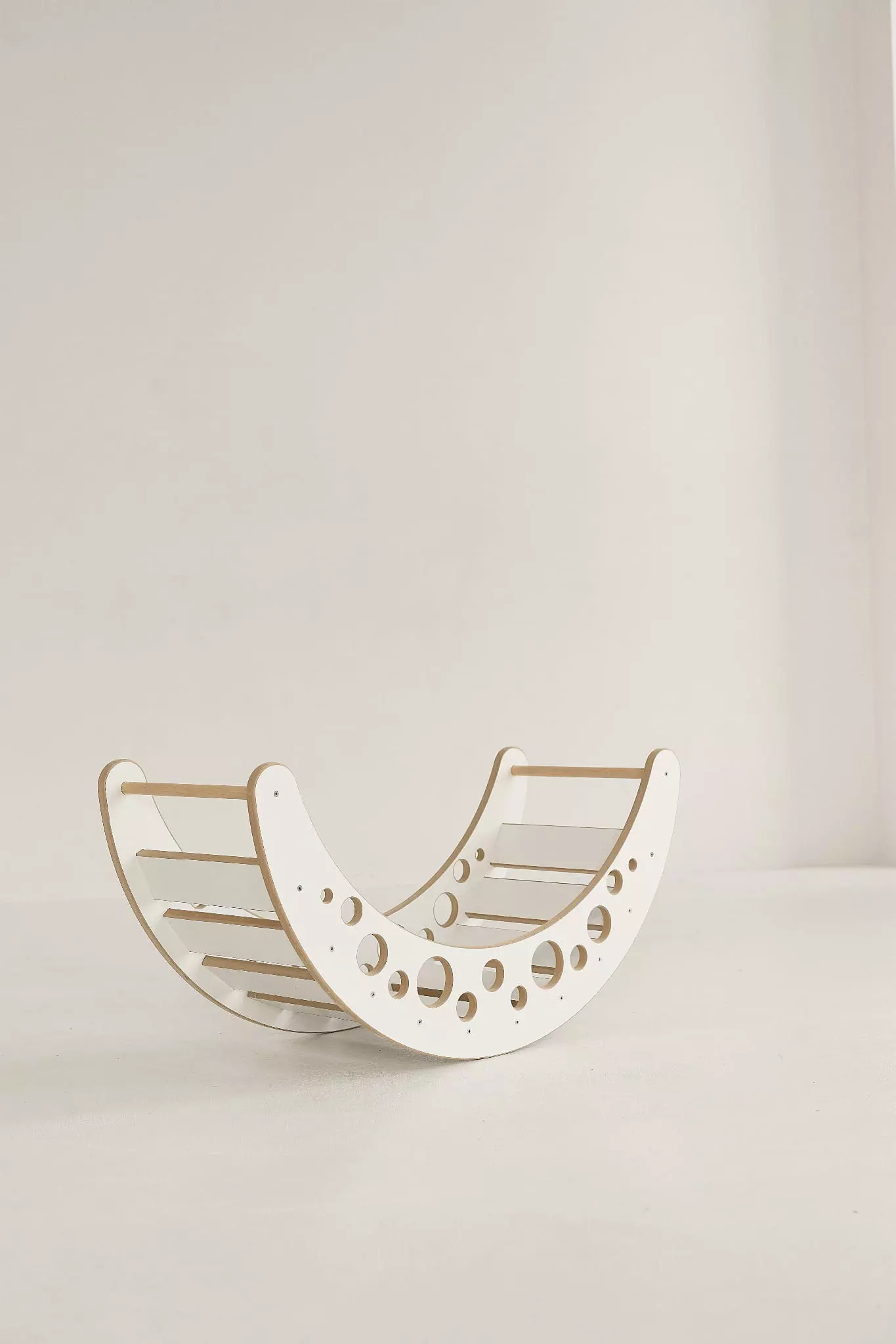 Für die Herstellung der Holzwippe verwenden wir nur hochwertige und geprüfte Materialien. In diesem Fall handelt es sich um laminiertes MDF, was die Babywippe extrem robust und stabil macht. Auch auf die Sicherheit der kleinen Nutzer legen wir großen Wert! Die überstehenden Kanten der Wippe wurden speziell abgerundet, damit sich das Kleinkind beim Spielen nicht verletzt. Die praktischen Griffe hingegen helfen dem Kind, die Montessori-Wippe jederzeit in Bewegung zu setzen oder zu stoppen.