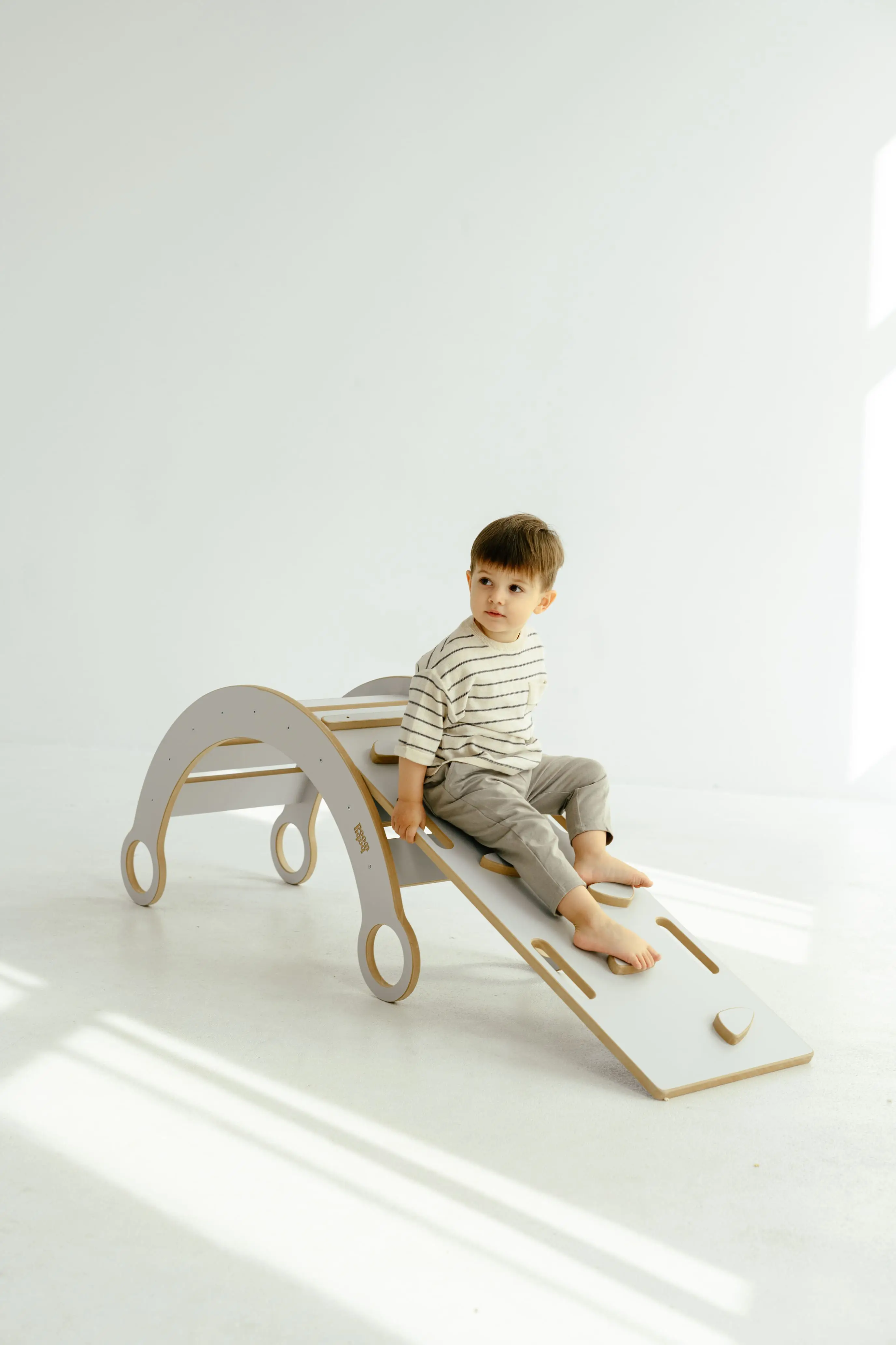 Im Set mit dem Holzschaukel finden wir ein multifunktionales Element, das gleichzeitig eine Kletterwand und eine Rutsche ist. Die Holzkletterwand ist ein Produkt, das vollständig mit dem BabyWood-Schaukel kompatibel ist. Sie ist eine perfekte Ergänzung dazu und bietet gleichzeitig viele neue Möglichkeiten! Eine Seite des Brettes enthält Klettersteine, die Ihrem Kind das Klettern erleichtern. Die andere ist glatt, was Ihr Kind dazu anregt, sie als Rutsche zu benutzen. Die Sprossen/Klettersteine wurden so auf dem Brett angebracht, dass die Befestigung an der Wippe für den kleinen Benutzer völlig sicher ist. Das Formbrett kann auch als Balancierbrett verwendet werden, indem man es einfach über die BabyWood-Holzwippe legt.