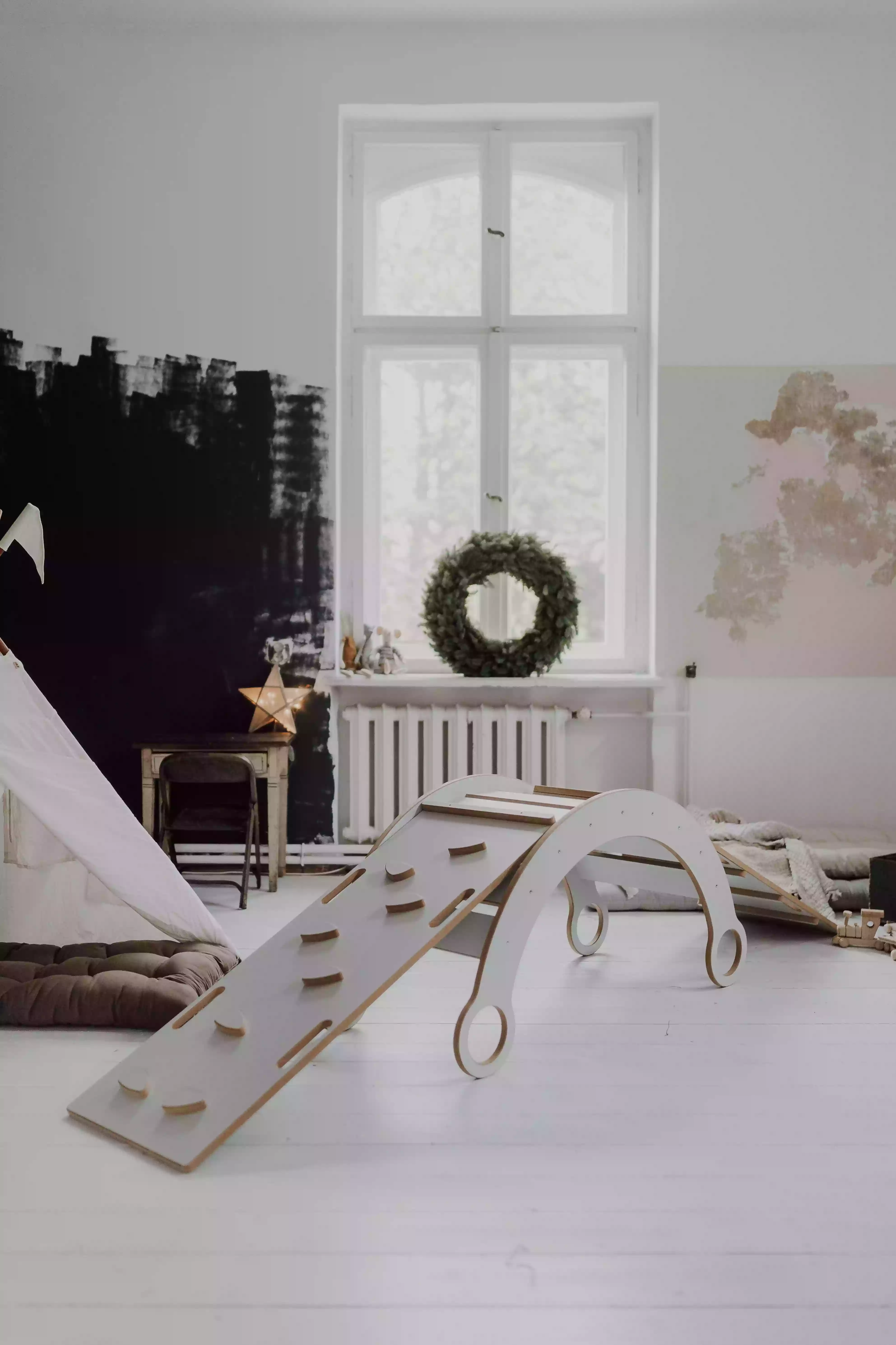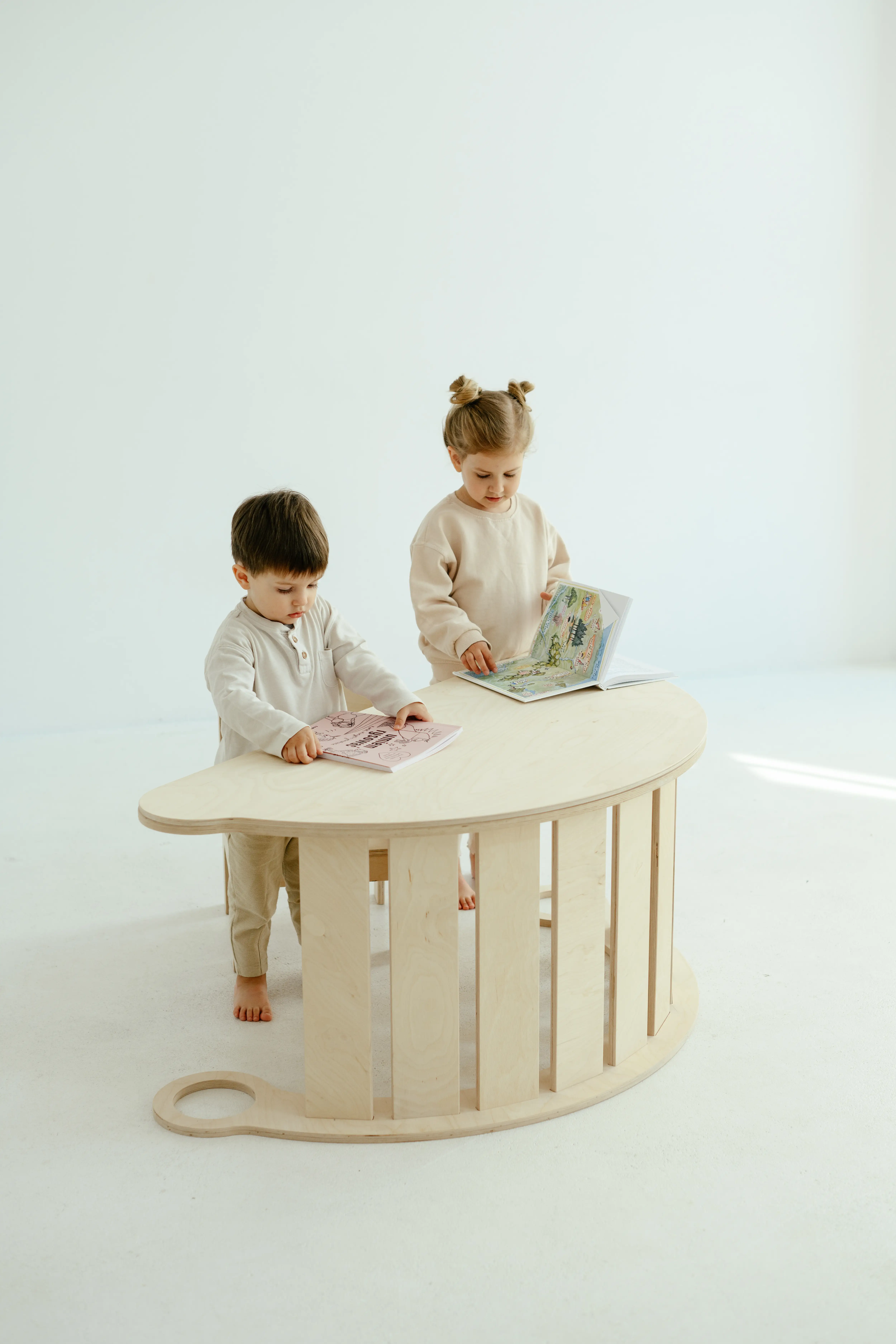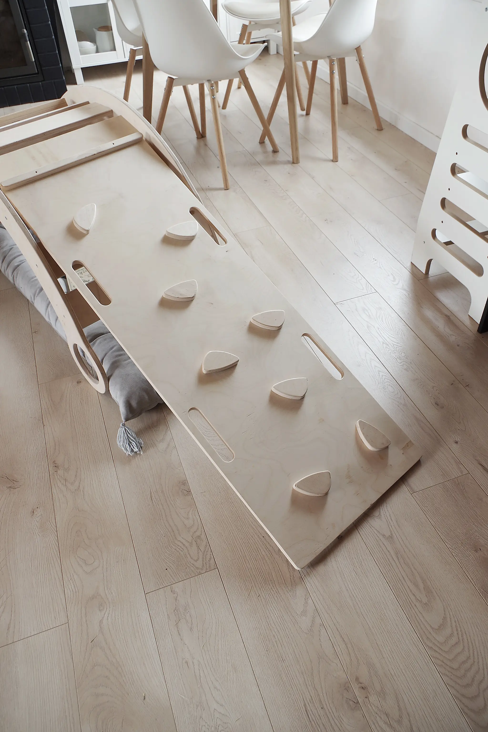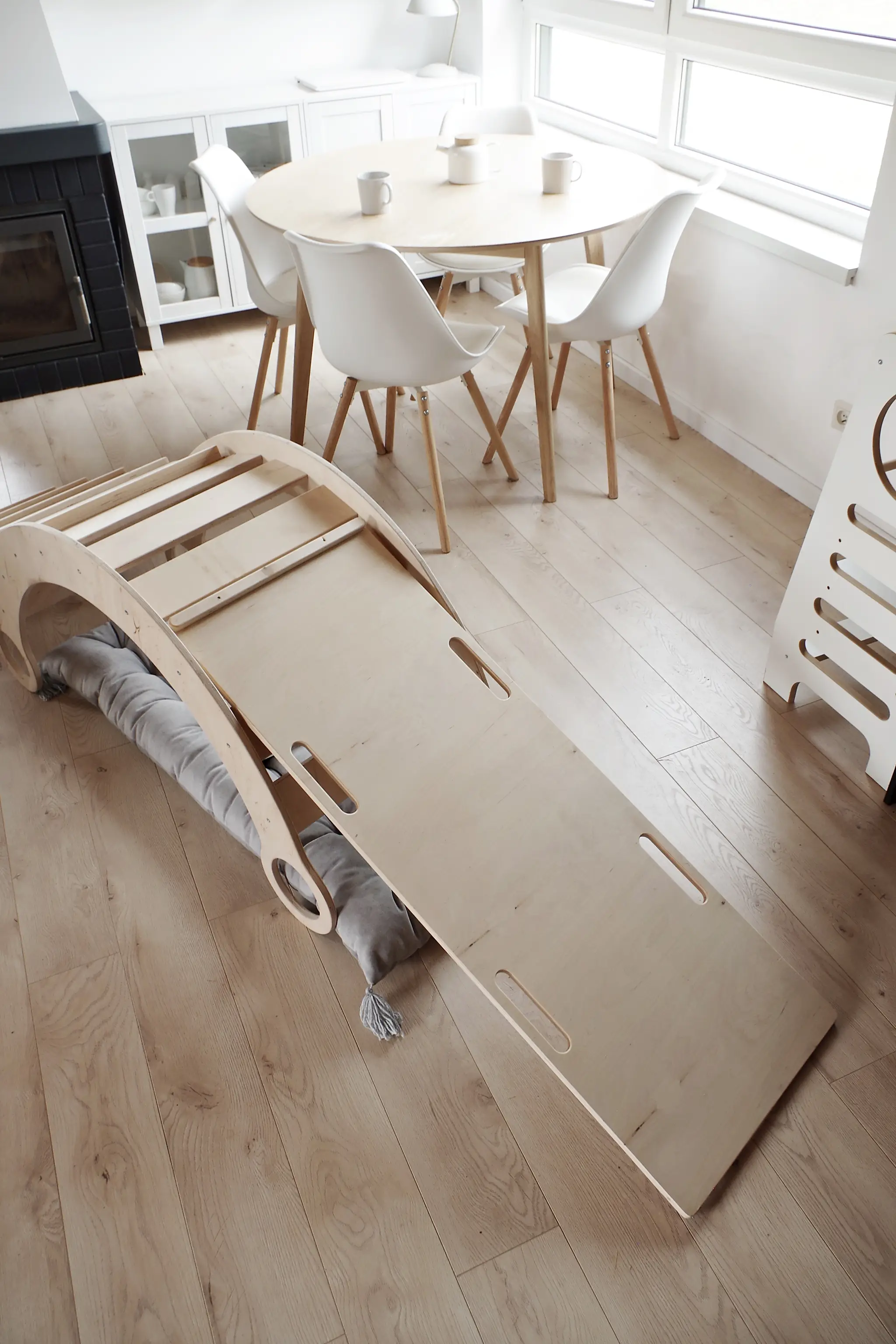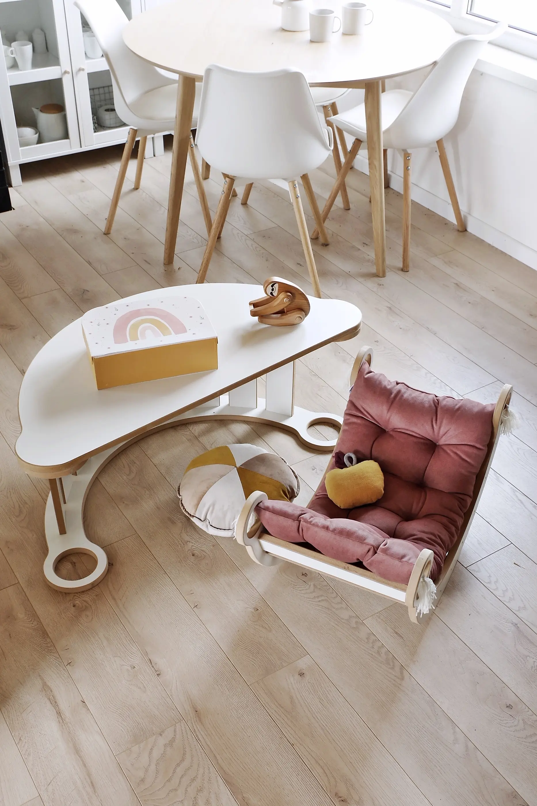 Eine Platte, die mit der Holzwippe kompatibel ist, gibt uns noch mehr Möglichkeiten, dieses scheinbar einfache Möbelstück zu nutzen. Indem wir sie auf die Wippe montieren, erhalten wir eine zusätzliche „Arbeitsfläche“, auf der wir spielen können. Im Handumdrehen lässt sich die Wippe in einen Tisch verwandeln, an dem das Kind seine Lieblingsmahlzeiten einnehmen, basteln oder mit Gleichaltrigen spielen kann. Dies ist eine großartige Lösung, besonders für kleine Räume. Sie spart mit Sicherheit Platz in einem kleinen Raum.
