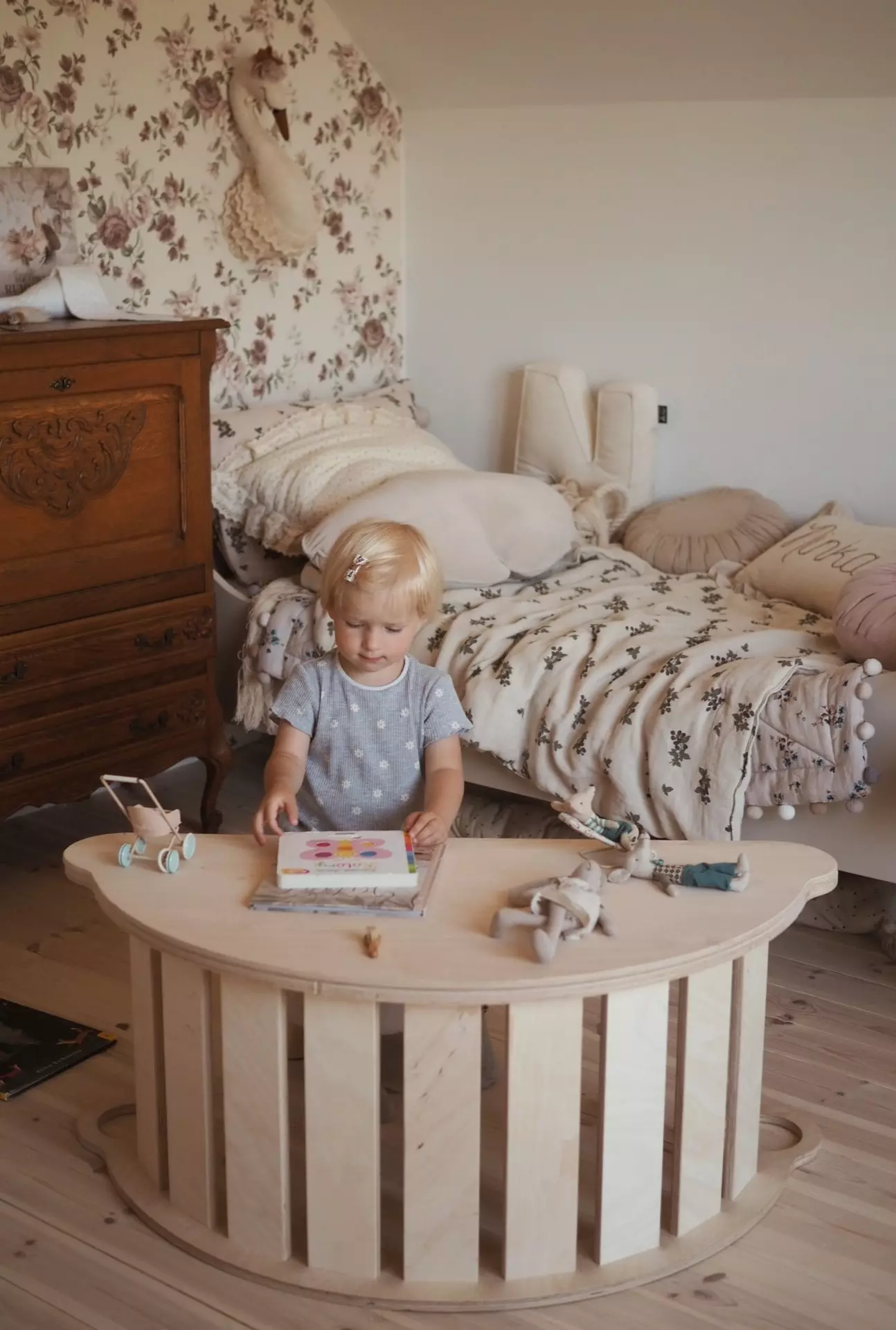 Eine Tischplatte, die mit der BabyWood-Wippe kompatibel ist, gibt Ihnen noch mehr Möglichkeiten, dieses scheinbar einfache Möbelstück zu verwenden. Indem wir sie auf die Wippe montieren, erhalten wir eine zusätzliche "Arbeitsfläche" zum Spielen. Im Handumdrehen lässt sich die Wippe in einen Tisch verwandeln, an dem das Kind seine Lieblingsspeisen einnehmen, basteln oder mit Gleichaltrigen spielen kann. Dies ist eine großartige Lösung, besonders für kleine Räume. Sie spart mit Sicherheit Platz in einem kleinen Raum.