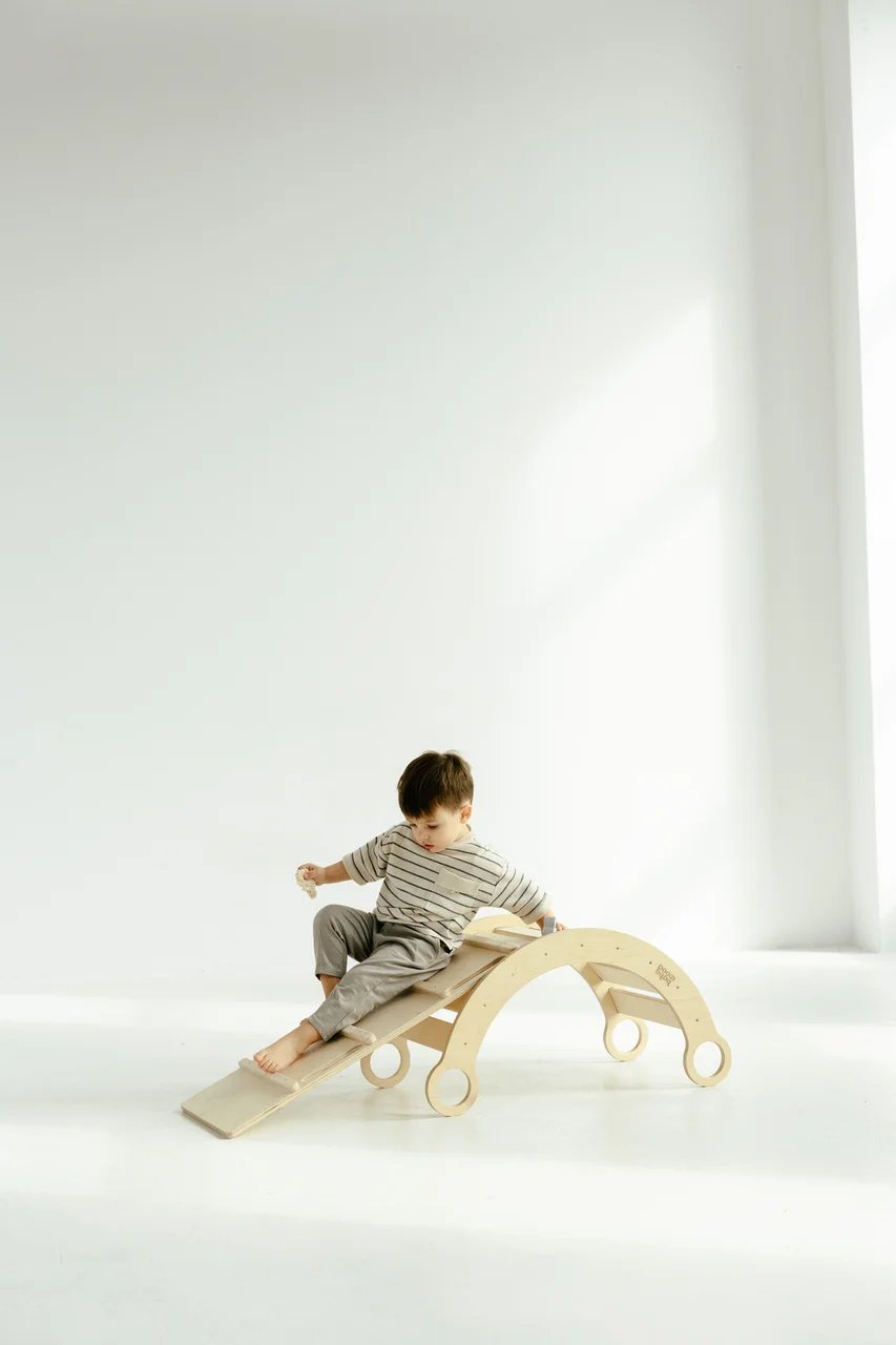 Das geformte Brett kann auch als Balancierbrett verwendet werden, indem man es einfach auf die BabyWood-Wippe legt.