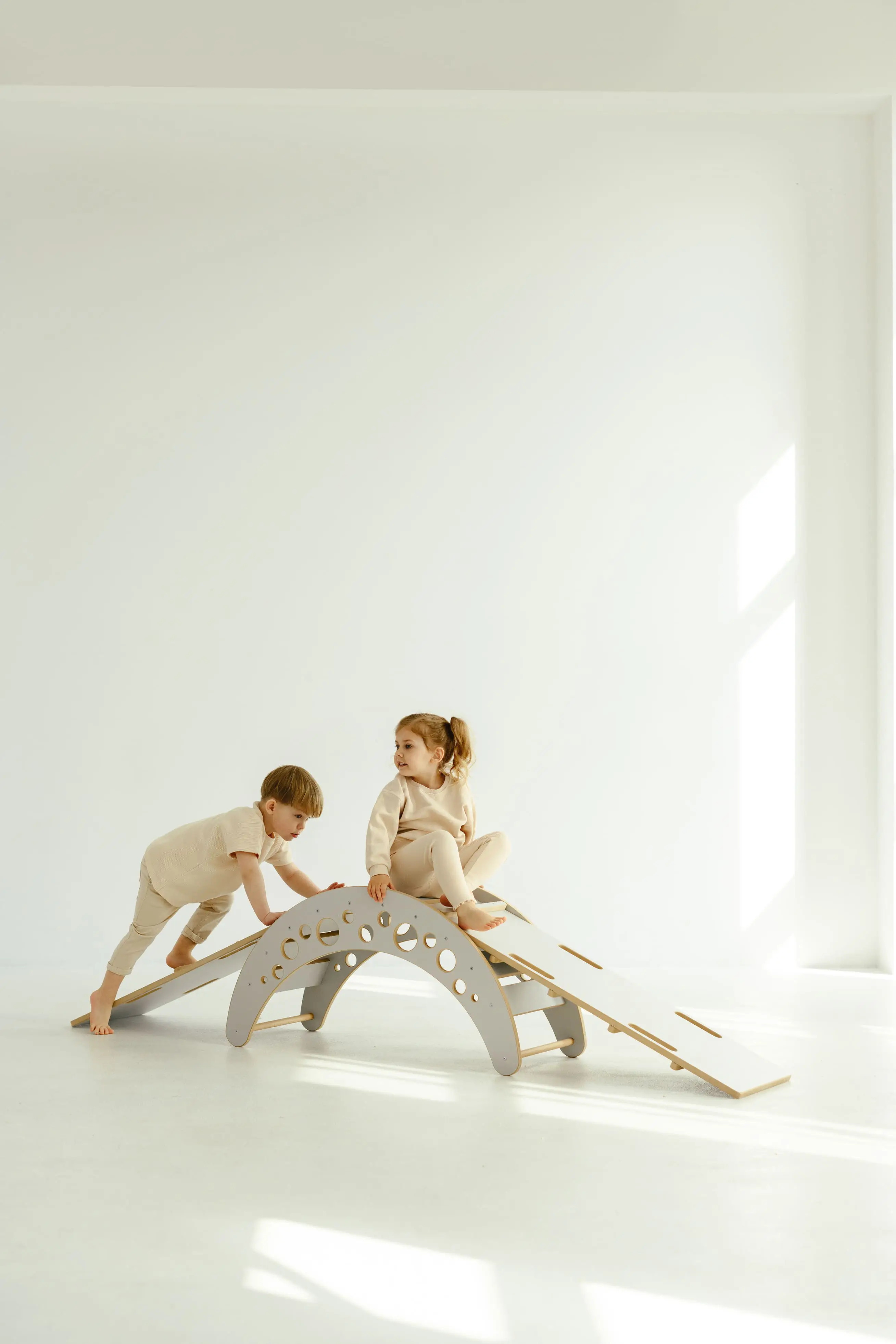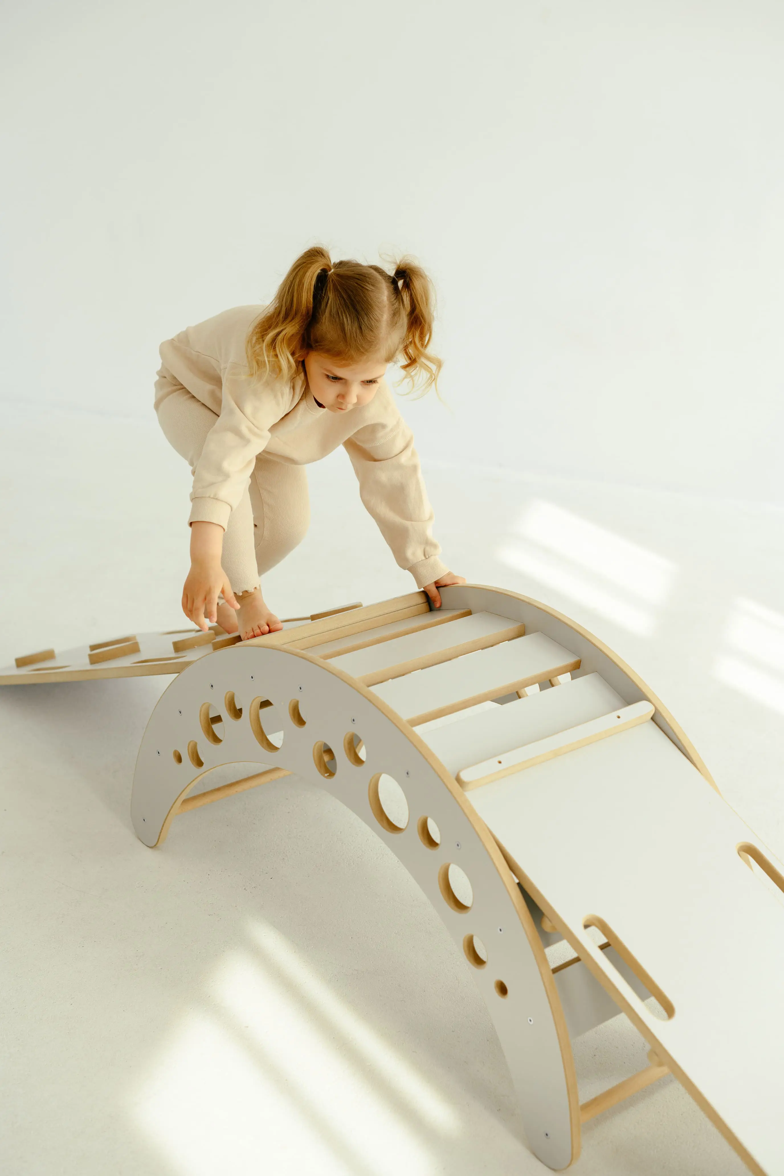 Zum Set gehört auch ein konturiertes Brett (oder sogar zwei), das auf jeder Seite Möglichkeiten für verschiedene Bewegungsaktivitäten bietet. Eine Seite ist völlig glatt, so dass sie als Rutsche dient und das Rutschen auf ihrer Oberfläche möglich ist. Auf der anderen Seite befindet sich eine klassische Leiter oder Kletterwand. Das Brett ist außerdem mit bequemen, ergonomischen Griffen ausgestattet, die es den Kindern leicht machen, nach oben zu klettern.