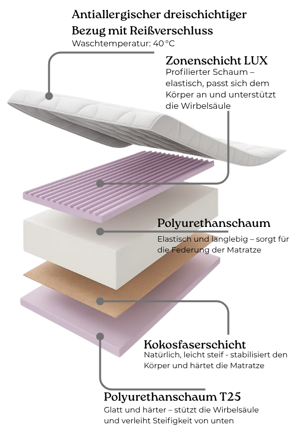 Die Matratze wird aus Materialien gefertigt, die nach dem OEKO‑TEX® Standard 100 zertifiziert sind – frei von schädlichen Substanzen, Farbstoffen und Schwermetallen. Der Bezug lässt sich leicht abnehmen und in der Waschmaschine bei 40 °C reinigen. Die Matratze wird in Polen hergestellt - unter Berücksichtigung der Qualität und der sicheren Verwendung.