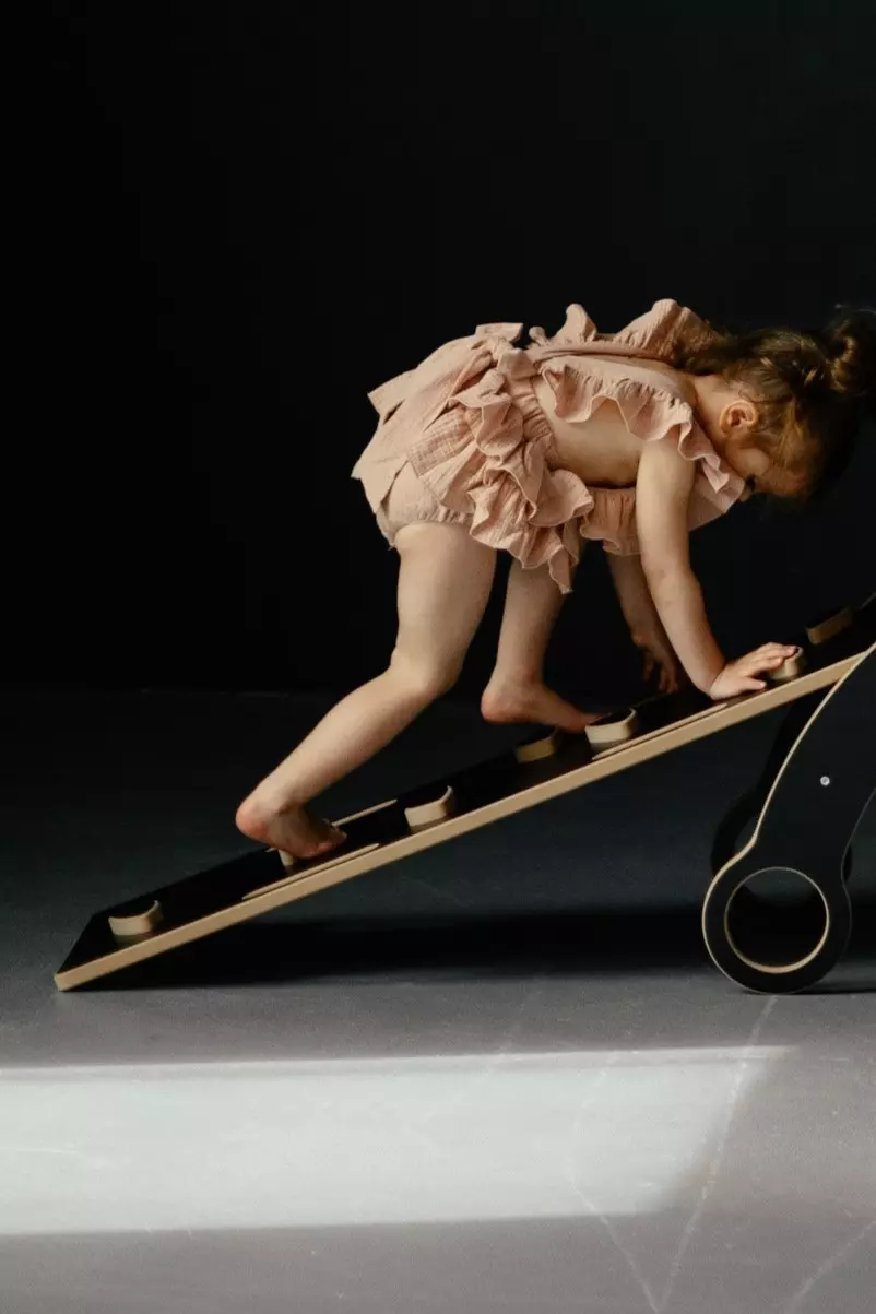 Eine Seite des Brettes ist völlig glatt, so dass das Kind frei rutschen kann. Wenn Sie das Brett auf die andere Seite drehen, erhalten Sie eine Kletterwand.