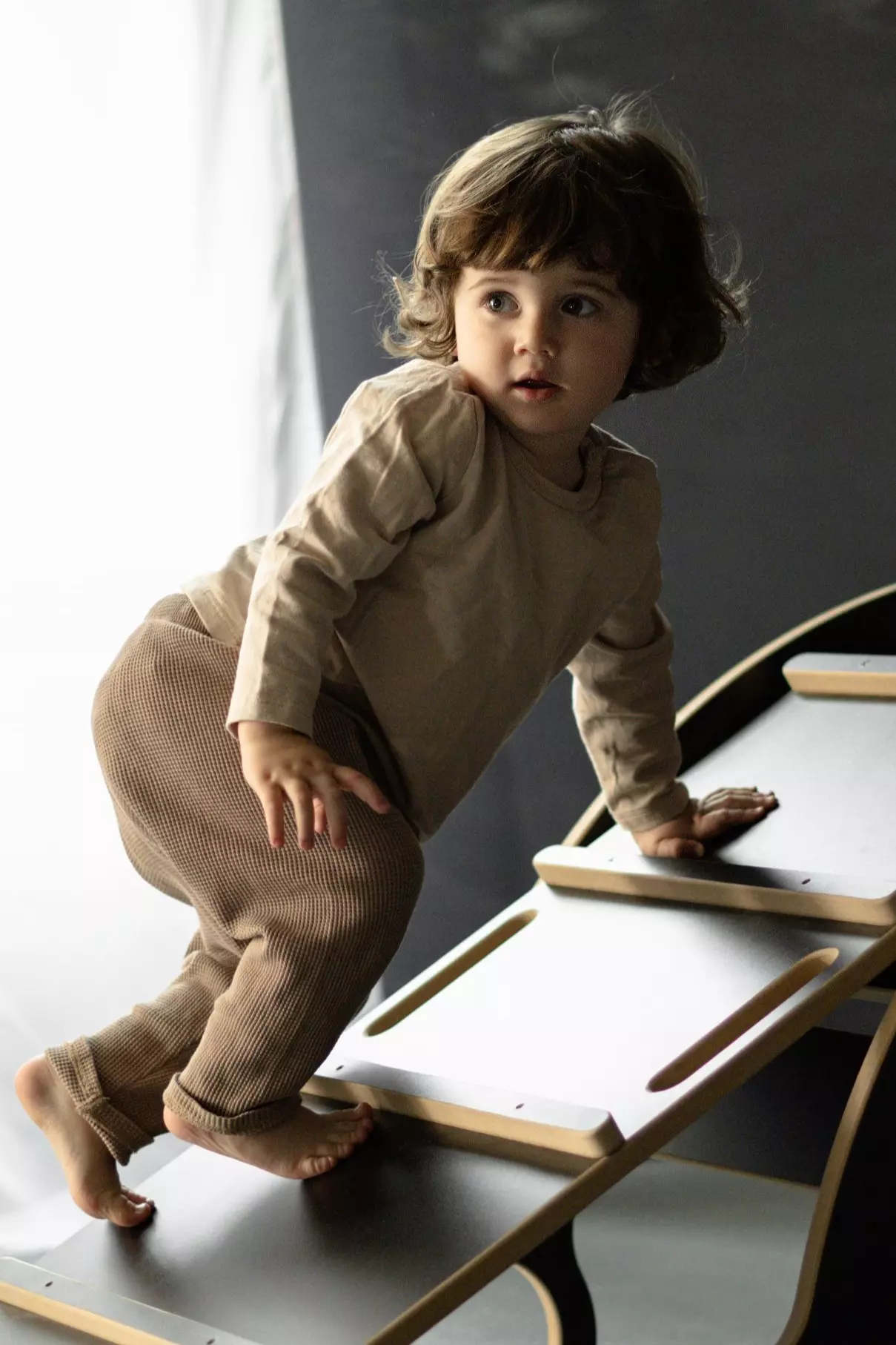 Die Möglichkeit, zusätzliches Zubehör für die Wippe zu kaufen, macht die Spielzeit für das Kleinkind noch attraktiver! Das doppelseitige Brett ist ein Produkt, das nicht nur mit der BabyWood-Holzwippe, sondern auch mit dem Kletterdreieck oder der Pikler-Leiter kompatibel ist. Eine Seite ist aus gutem Grund völlig glatt - sie ist als Rutsche gedacht. Die glatte Oberfläche ermöglicht es den Kindern, auf ihr zu rutschen. Die andere Seite hat klassische Sprossen, die es den Kindern erleichtern, nach oben zu klettern. Damit die Leiter für das Kind leicht zu bedienen ist, haben wir zusätzliche ergonomische Griffe an der Oberfläche angebracht.