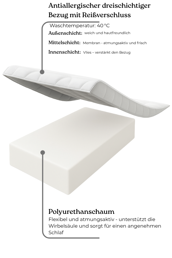 – Unterschicht: Verstärkende Vlieslage – schützt den Matratzenkern
