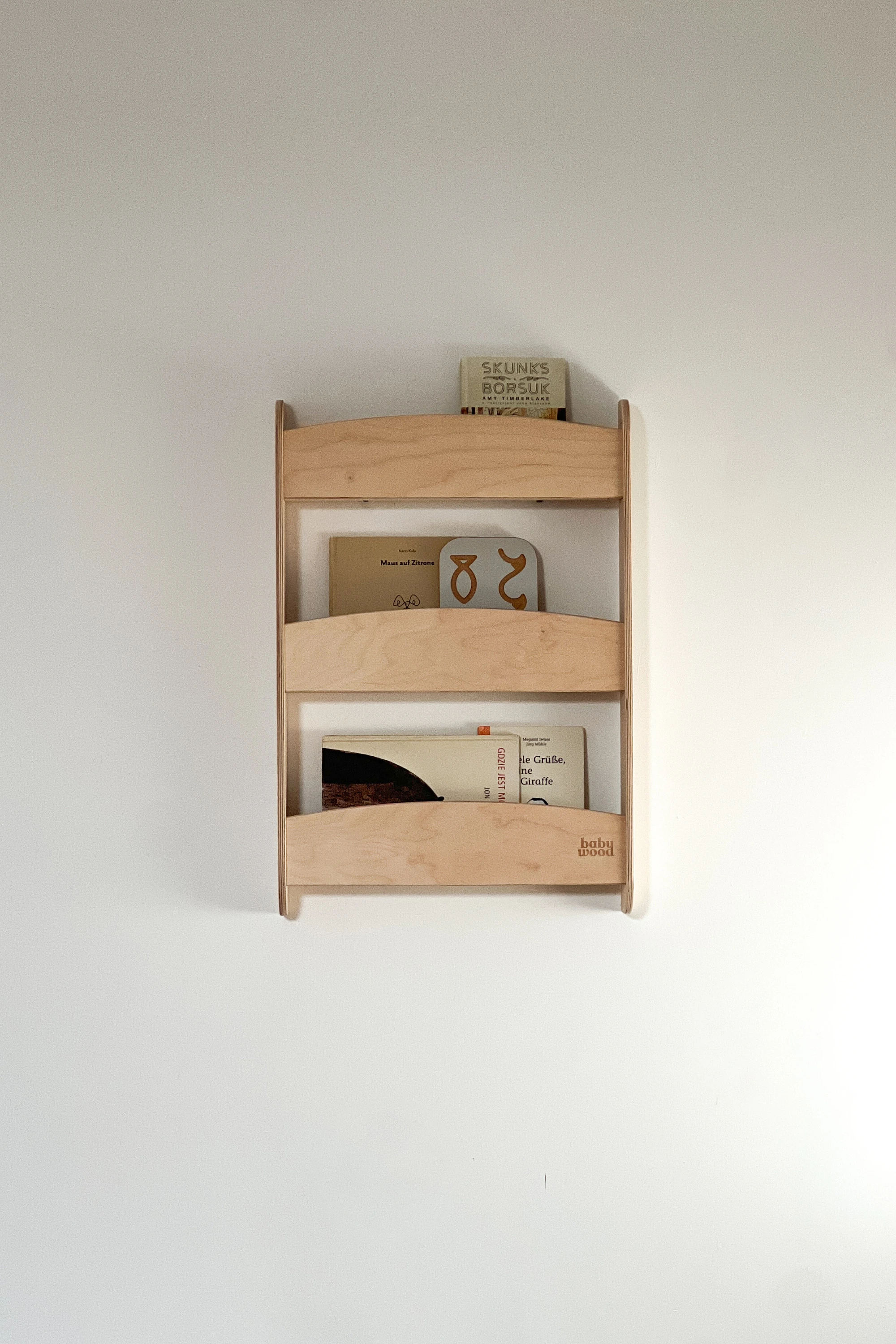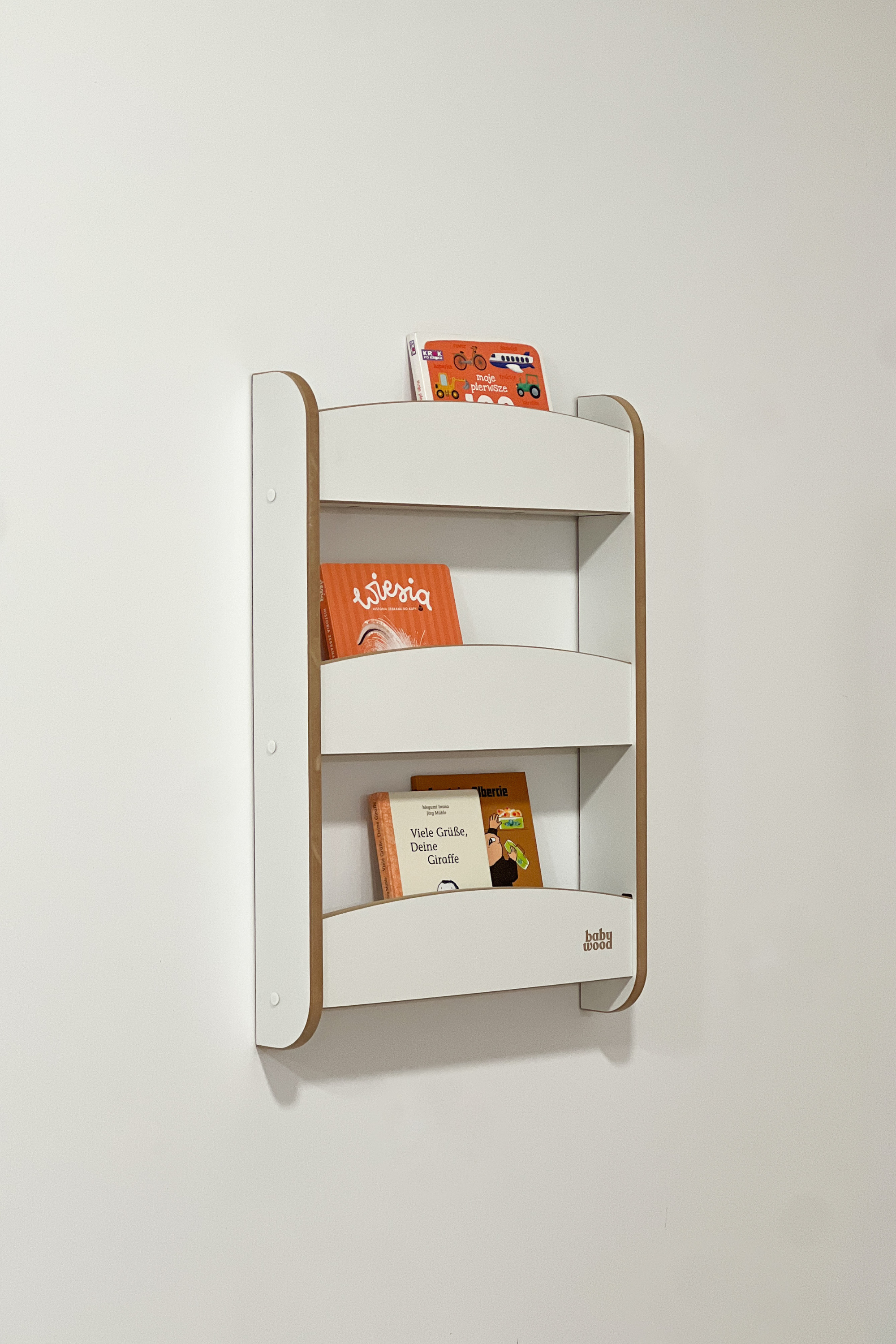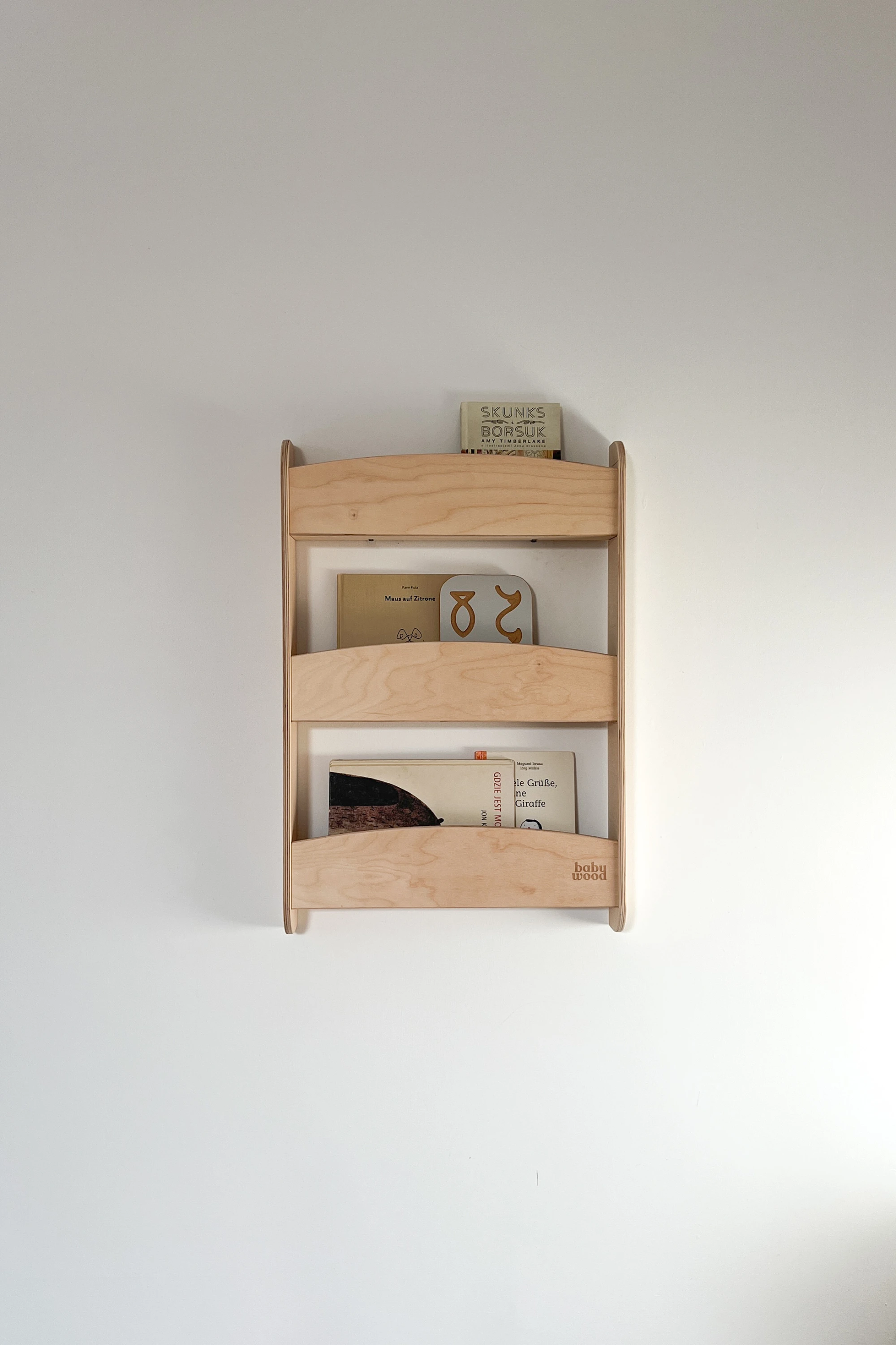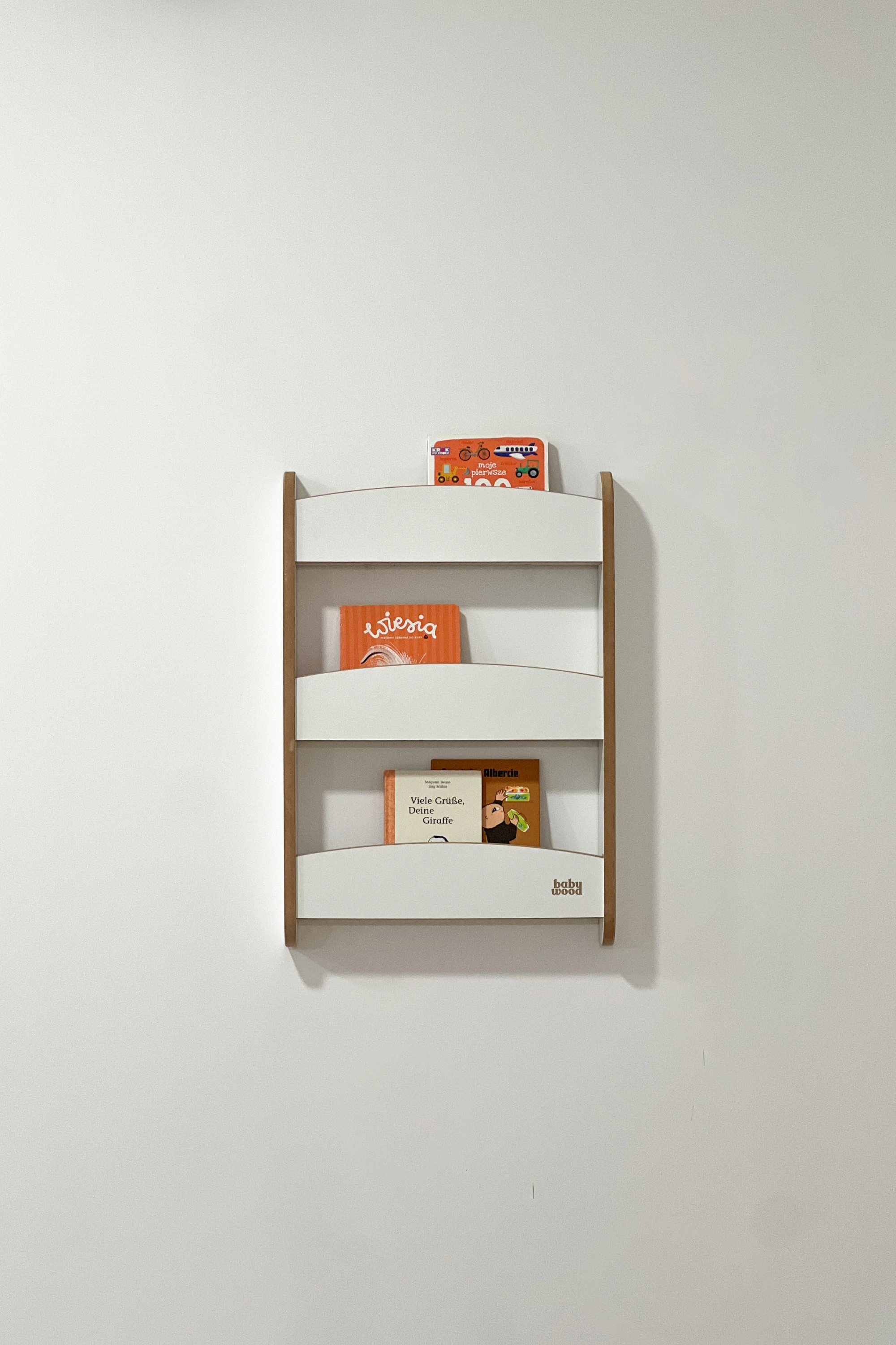 Stell dir ein Regal vor, das nicht nur Ordnung schafft, sondern auch Teil eurer täglichen Rituale wird. Drei Ebenen bieten Platz für Bücher, Erinnerungsstücke und all die Kleinigkeiten, die für dein Kind wichtig sind. Die Höhe? Bestimmst du selbst. Auf der unteren Ebene sind Bücher immer in Reichweite kleiner Hände; weiter oben kann der Elternteil über die Ordnung wachen. Und die süße Wellenkante verleiht dem Regal Wärme und macht die Bücher zu einem dekorativen Element.