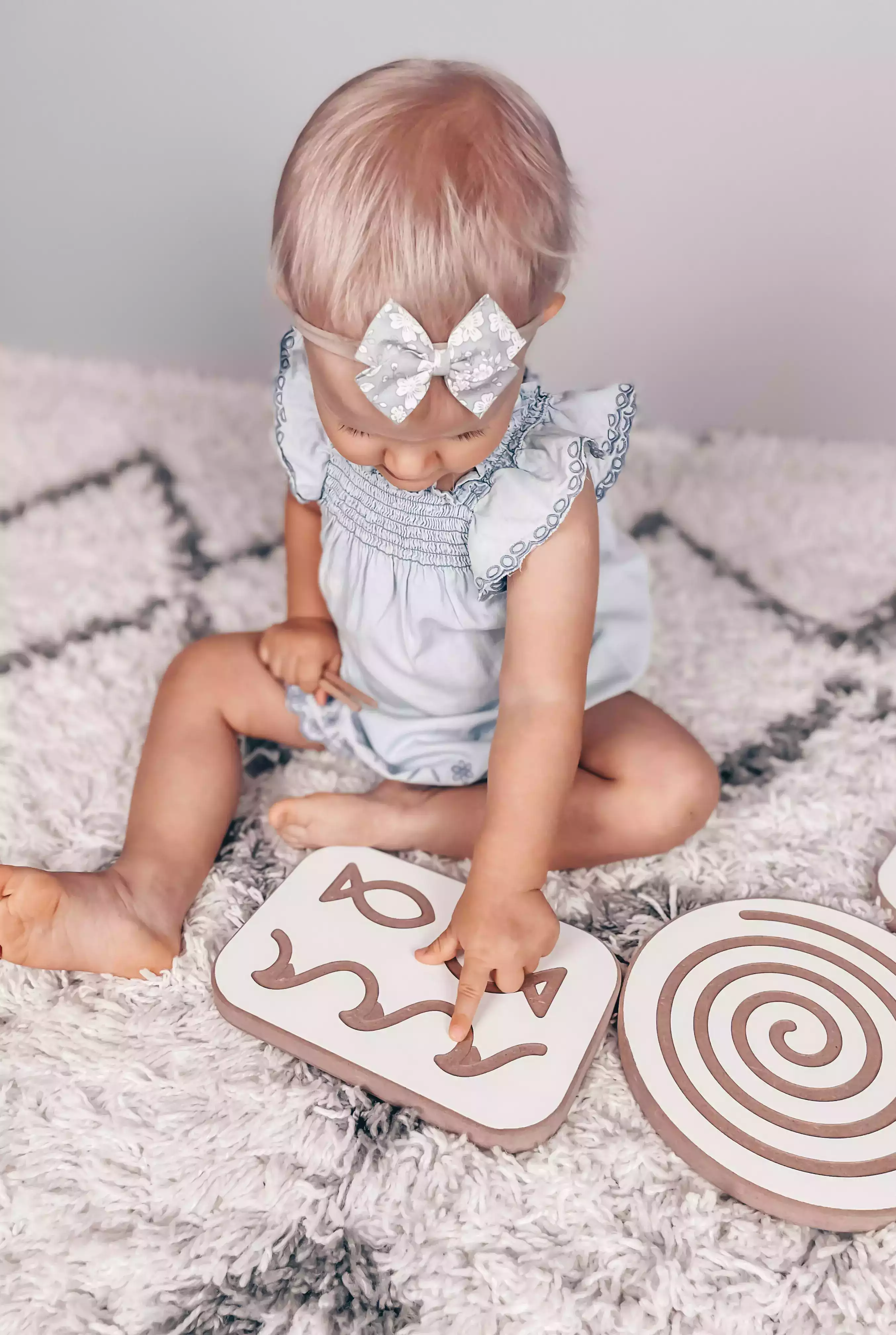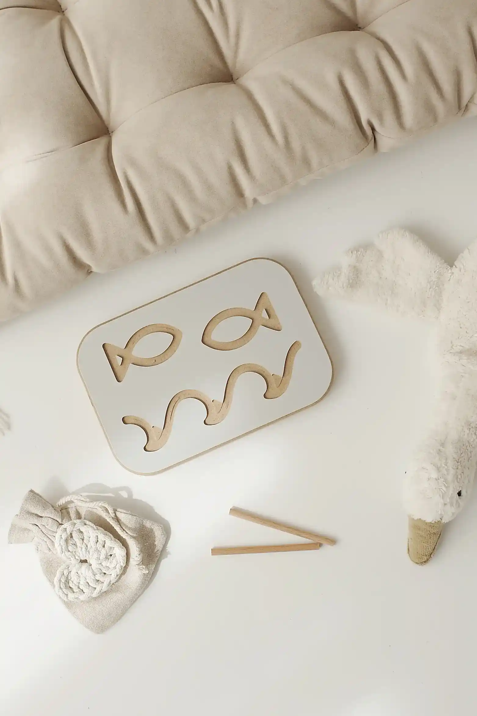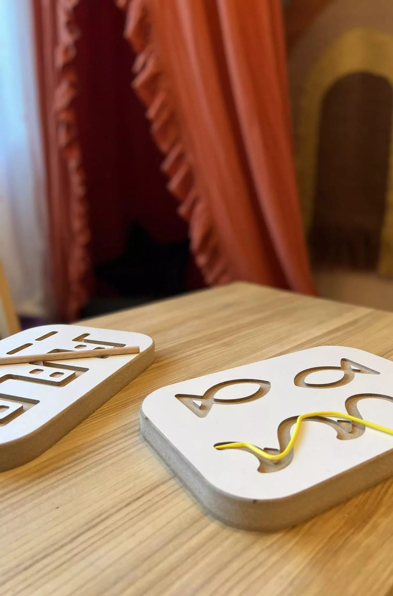 Various patterns have been cut into the boards, which attract the young child's eyes. The toddler, using his fingers, a brush or a stick, outlines the shape found, practicing motor skills.