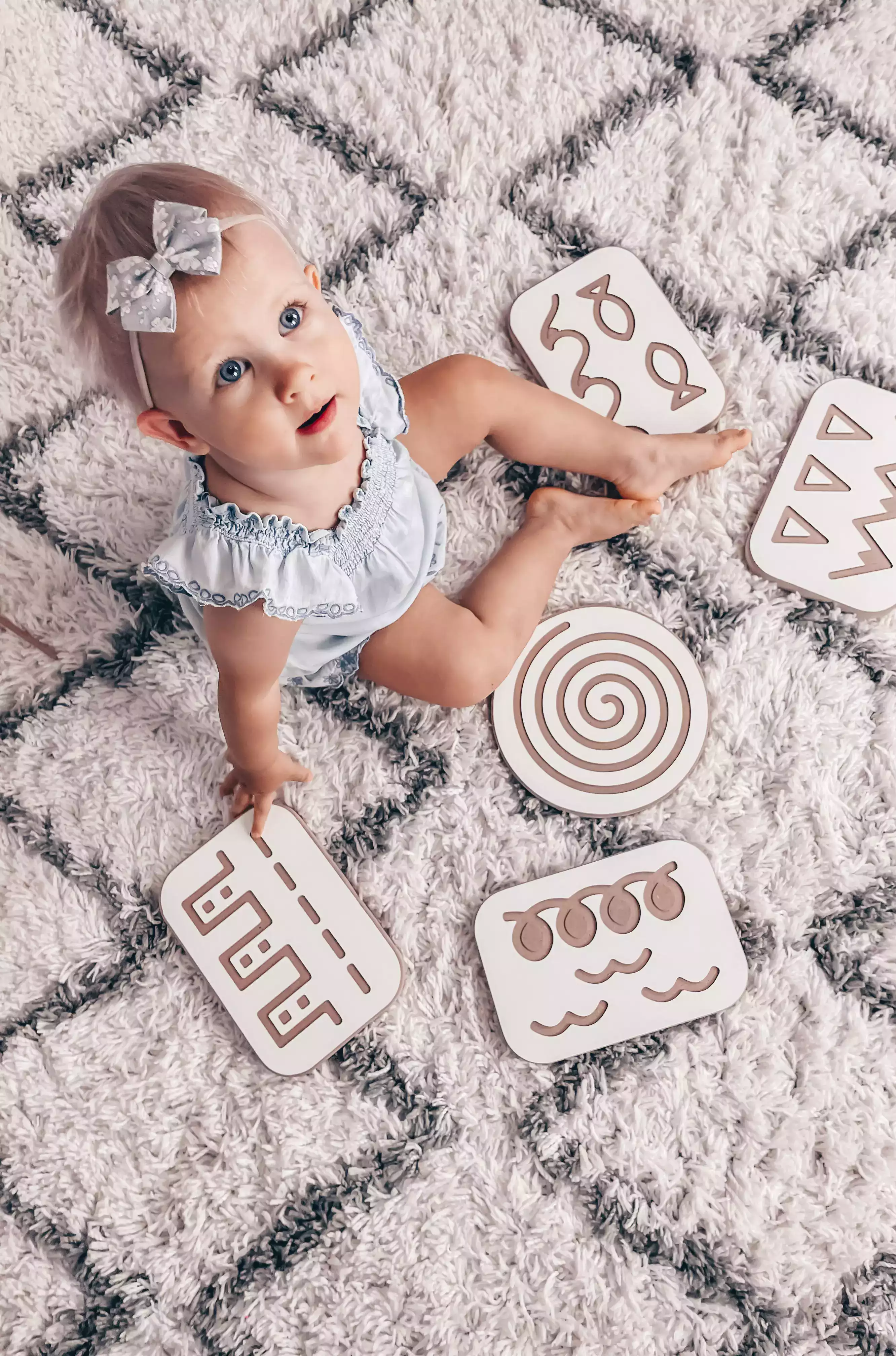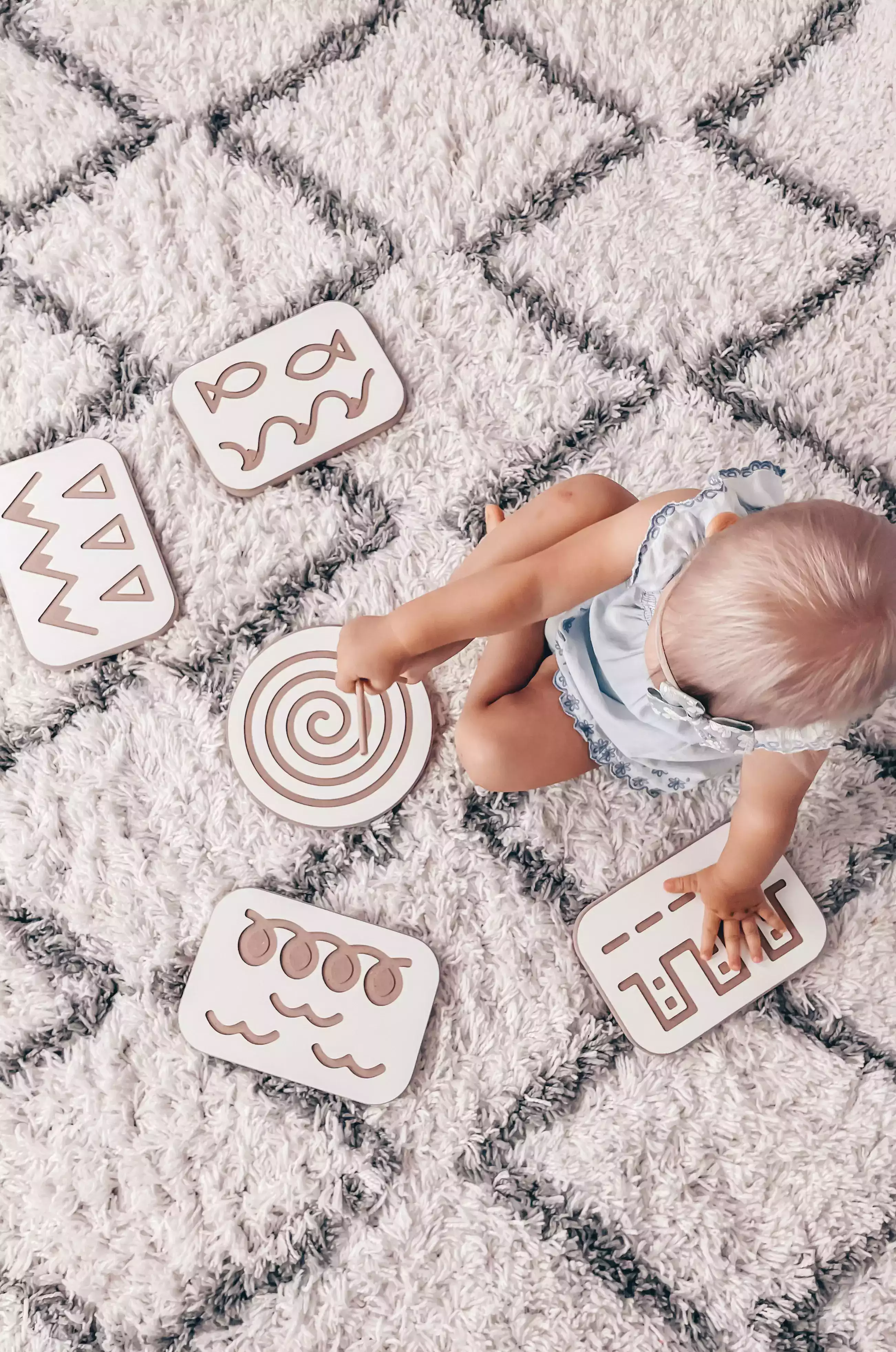 Various patterns have been cut into the boards, which attract the young child's eyes. The toddler, using his fingers, a brush or a stick, outlines the shape found, practicing motor skills.