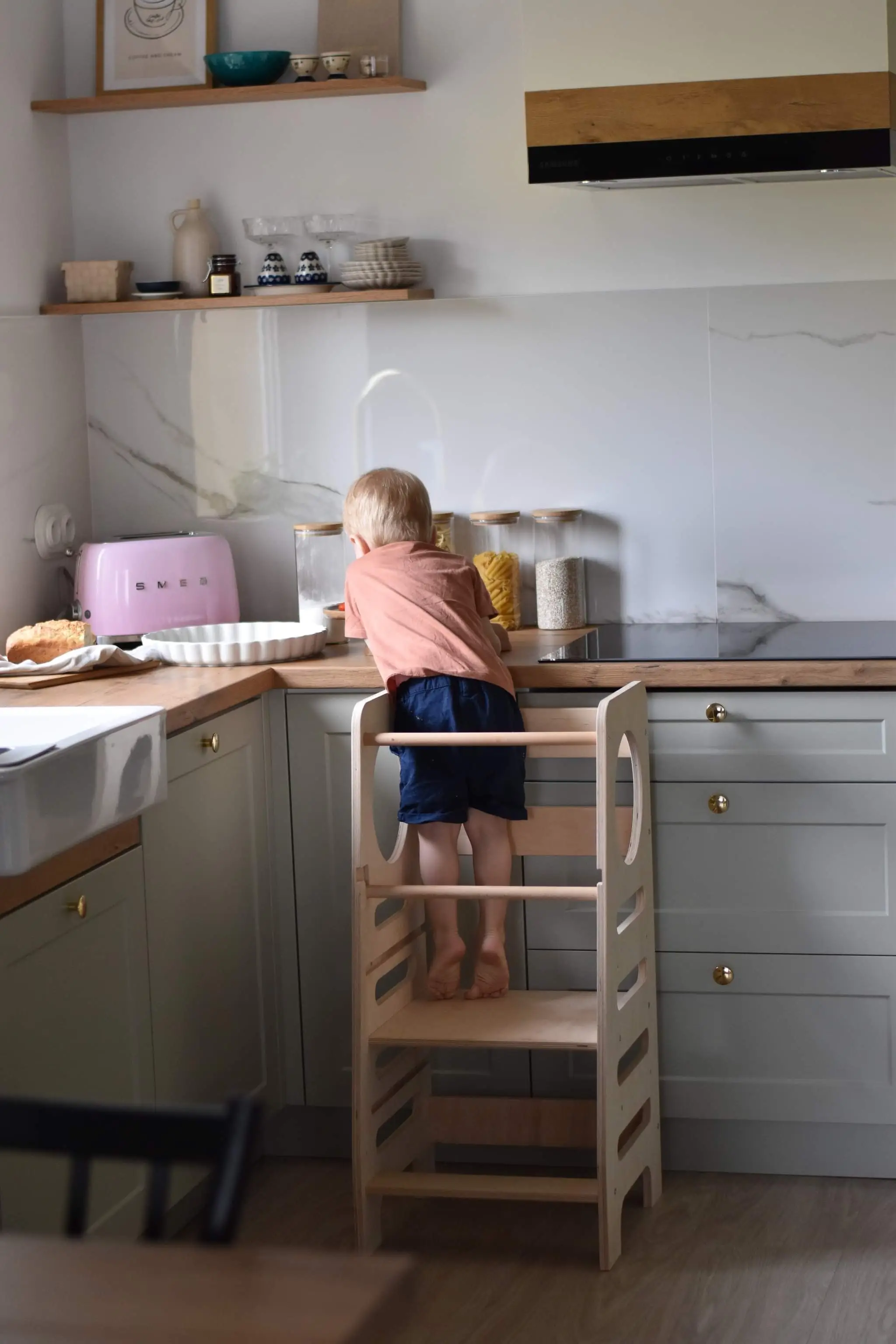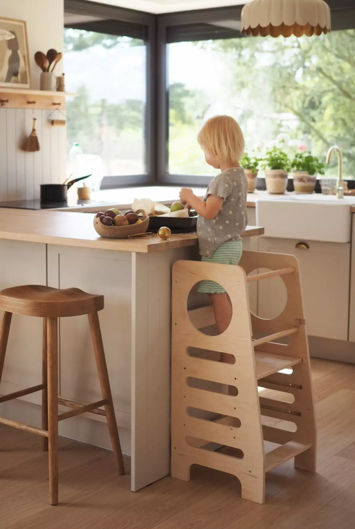Kitchen Helper has a 3-stage adjustable platform, so you can easily adjust it to the current needs of your child, regardless of age. A great attribute of it is also rounded edges and additional rungs, which will ensure safe play for the Toddler.