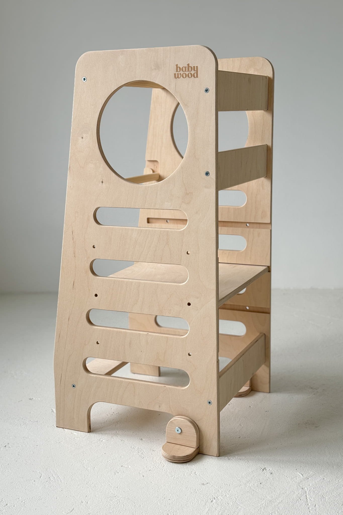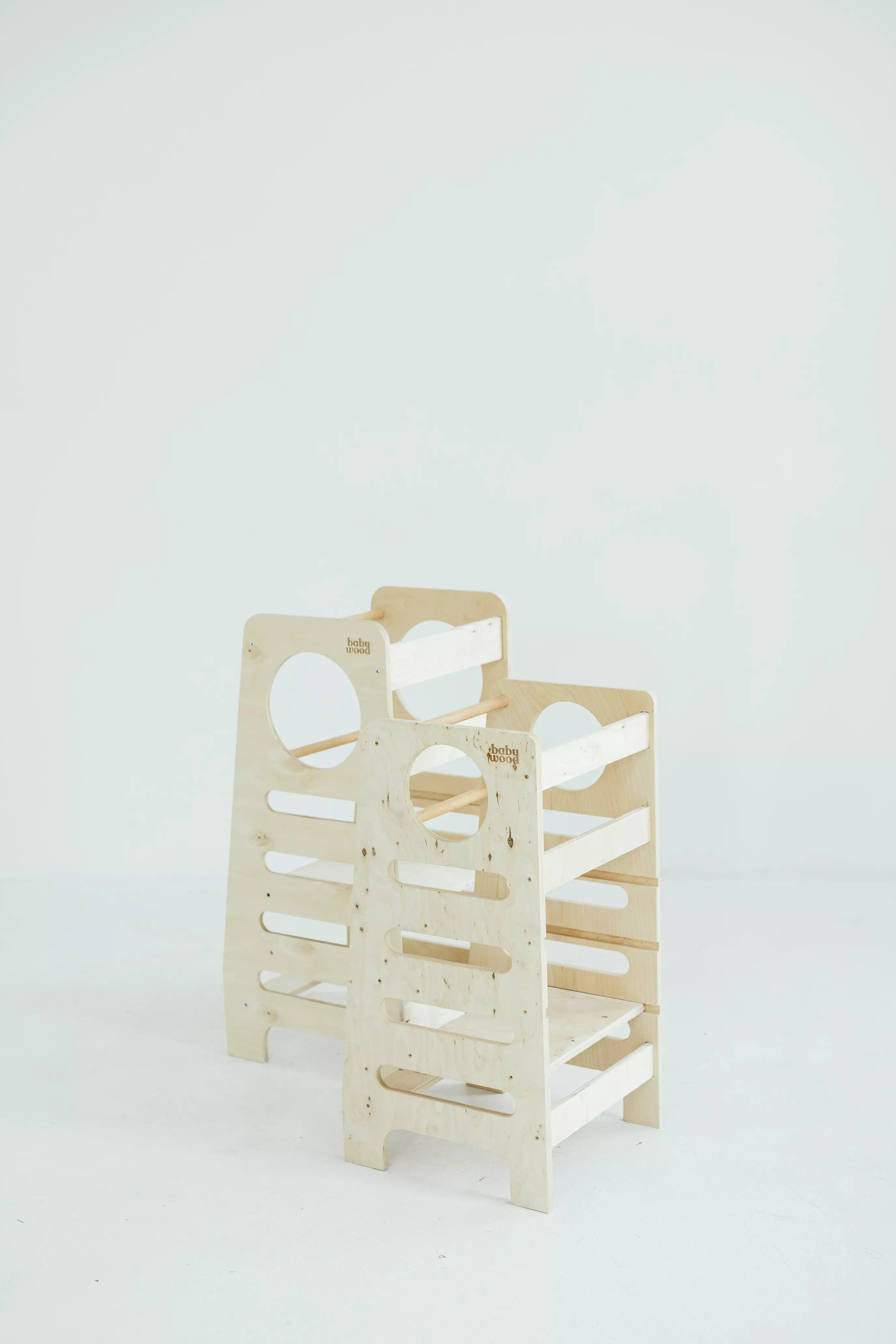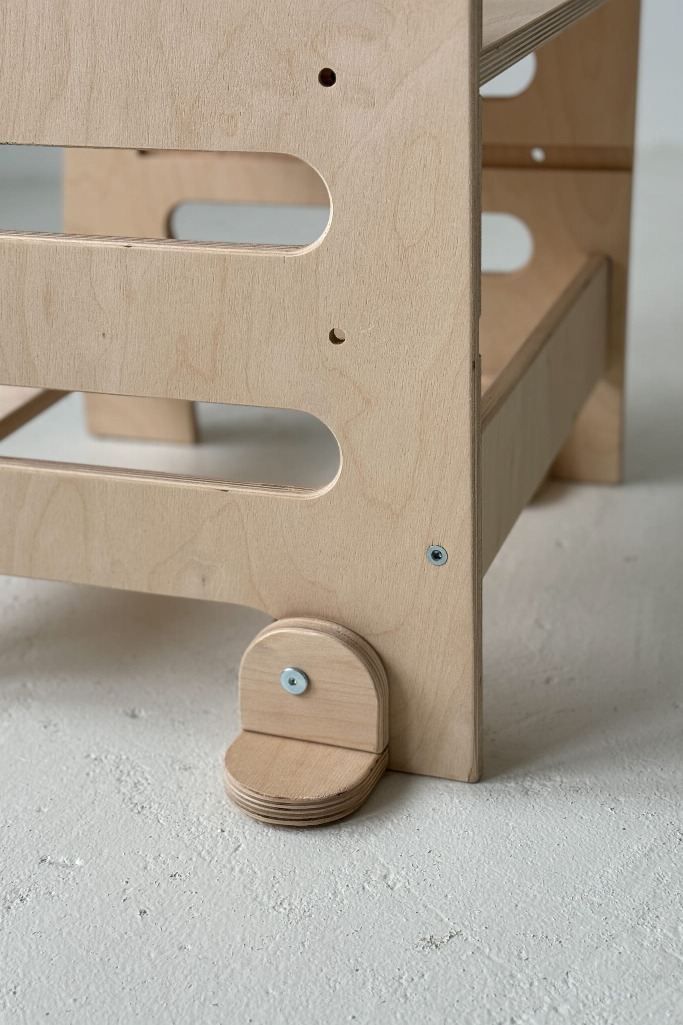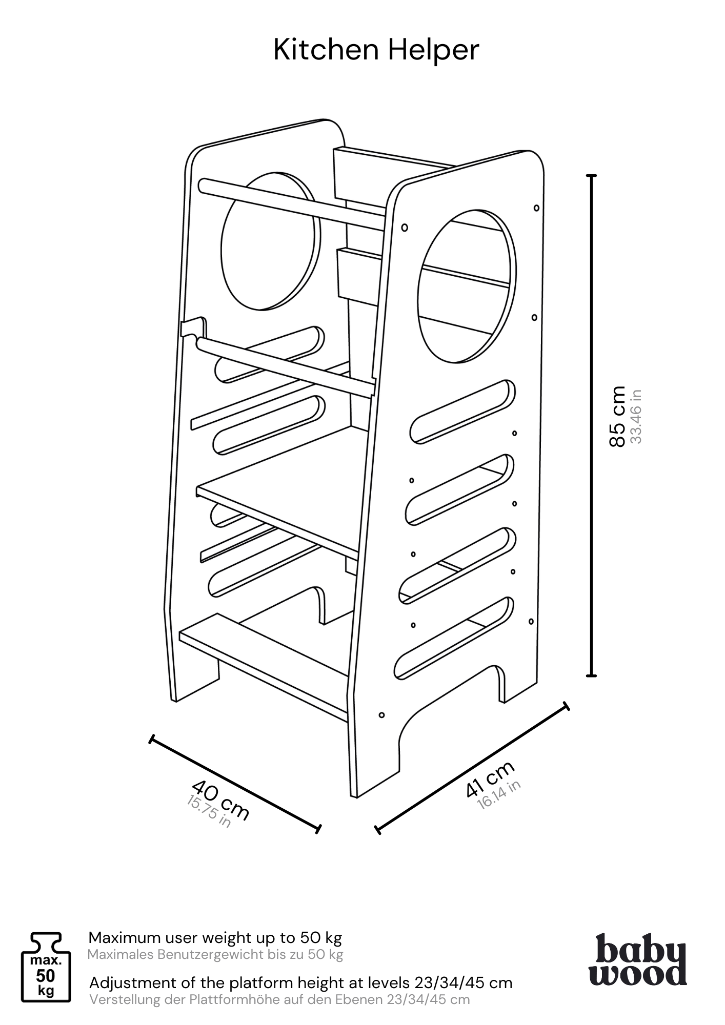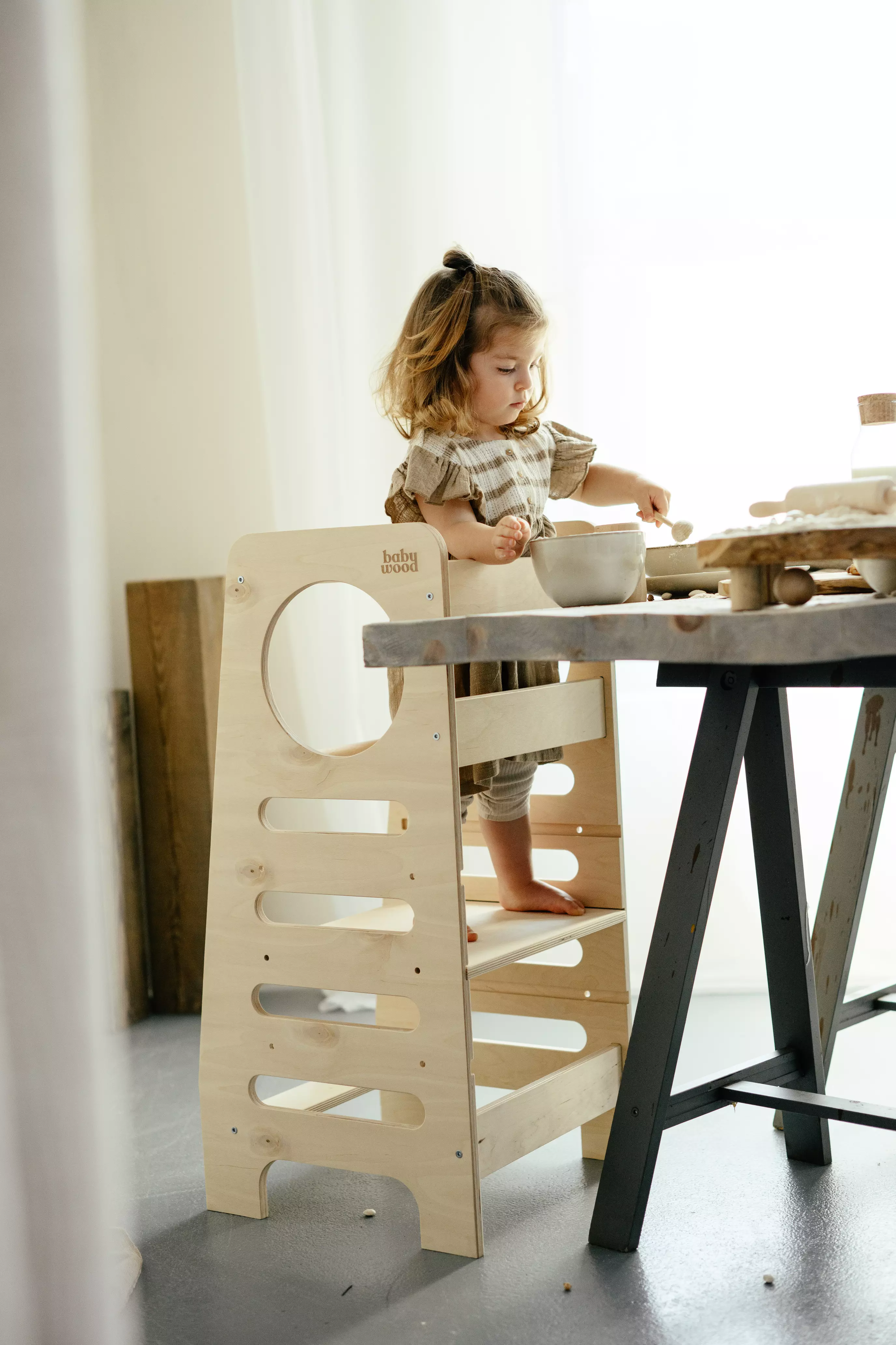 Kitchen Helper by BabyWood will create a safe space for your child to learn and play. It is a combination of a stable platform, footstool and kitchen helper, which thanks to its functionality will delight every Toddler and his parent. Using the Kitchen Helper, the child will easily reach the kitchen countertop or table, and thus will be able to perform simple tasks on their own, such as: cutting, mixing, and even washing up after finishing a meal. Of course, all this under the watchful eye of a parent!
