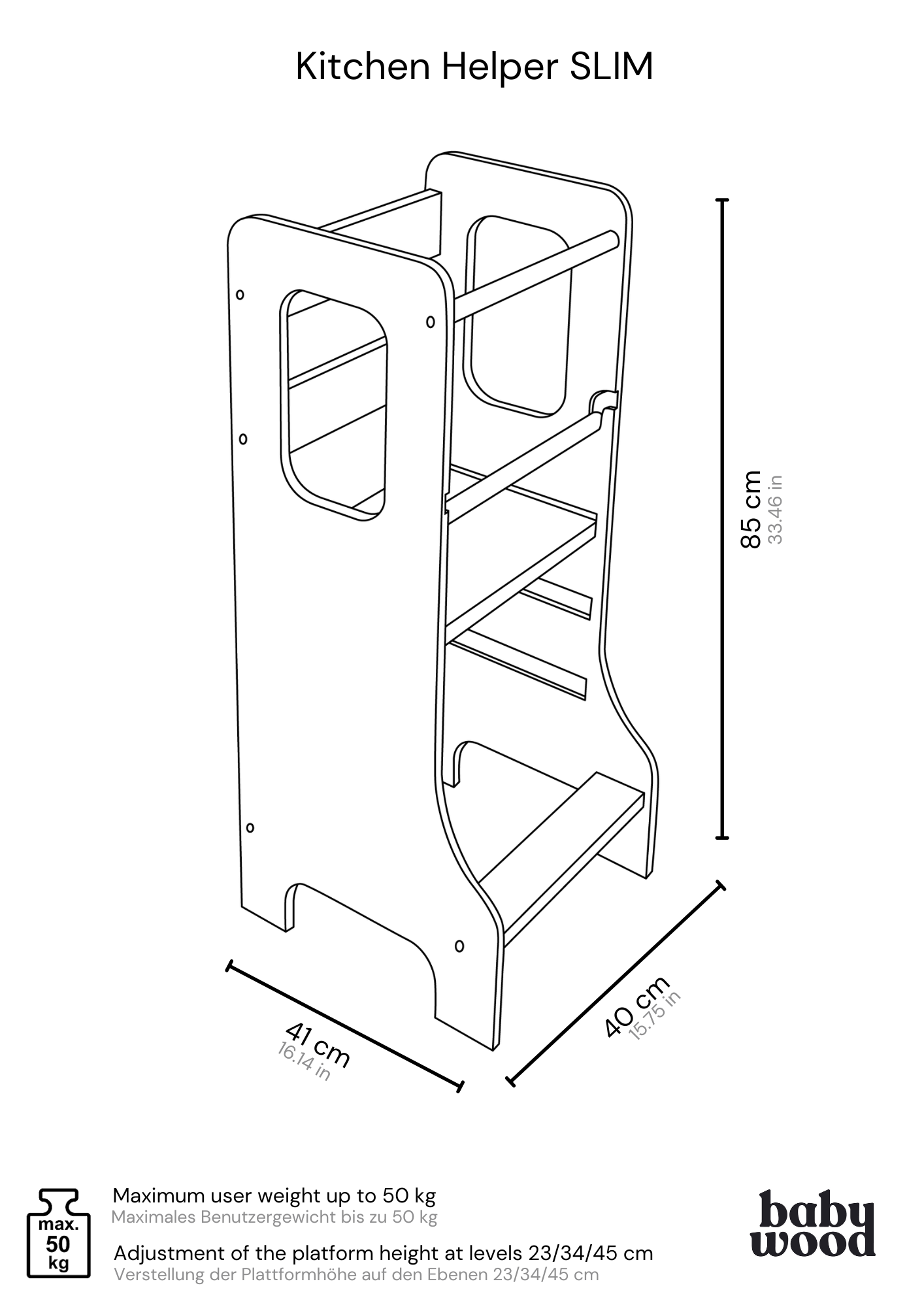 Thanks to 3 degrees of platform adjustment, Kitchen Helper will work well from the youngest age. Standing on his own, the toddler can easily start his kitchen adventure. The helper will grow with him.